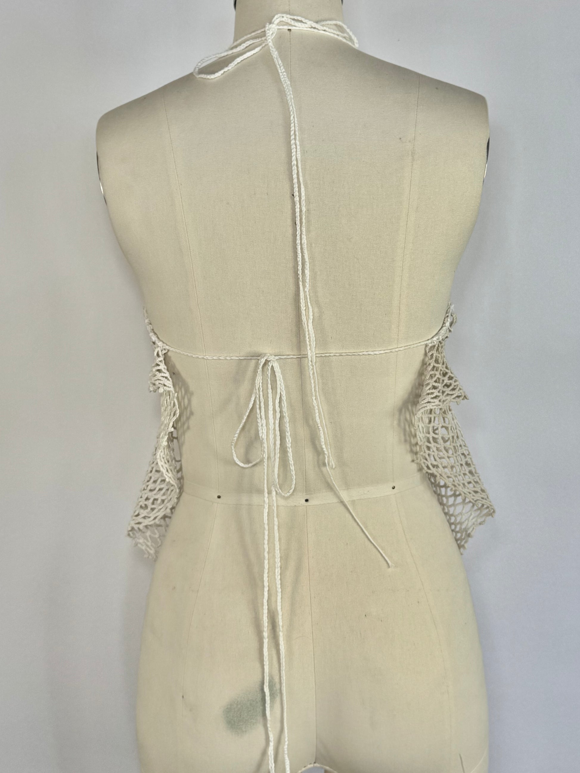 Lightweight and airy, the Fishnet Halter Top is made from a single oversized vintage doily with an open, net-like weave. Ties at the back and neck for an adjustable fit. Fits sizes 0–6.