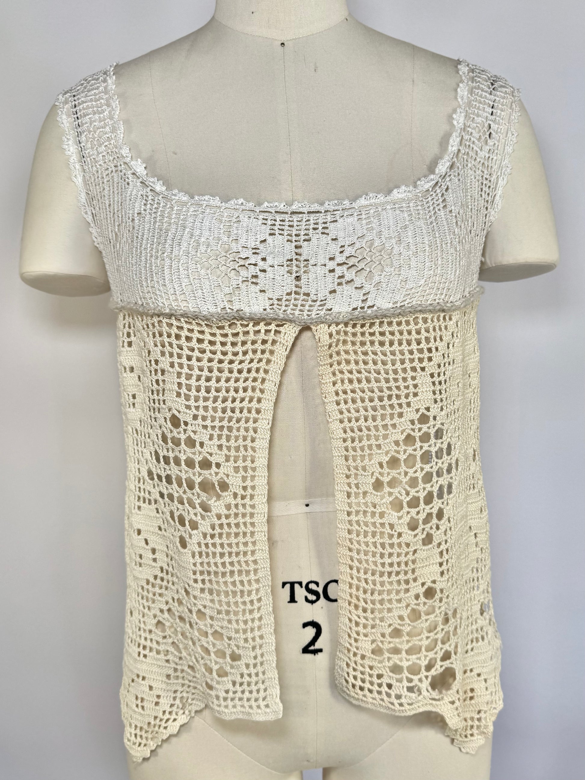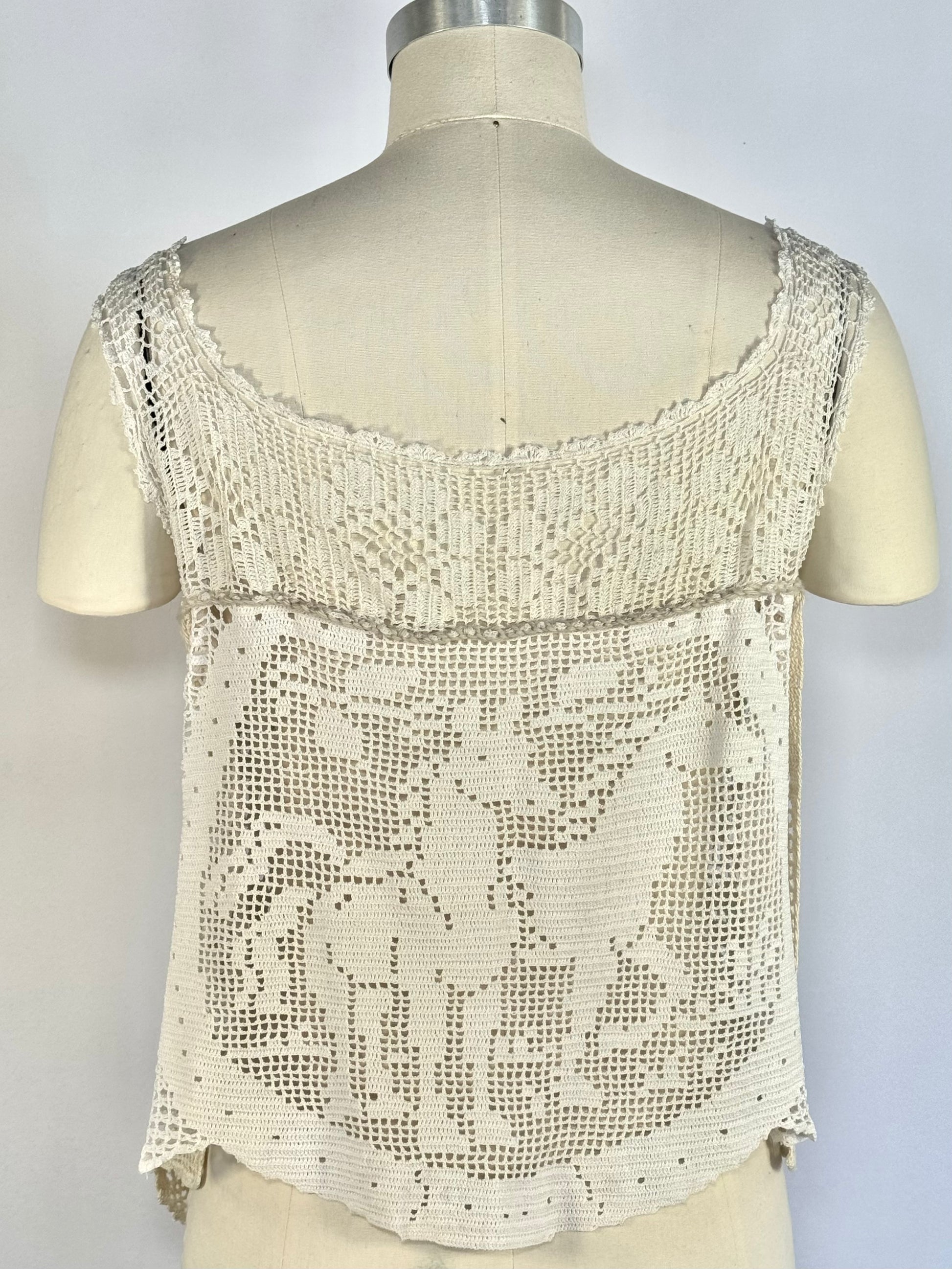 A rustic yet romantic piece, the Horse Girl Tank Top is crafted from a vintage crochet yoke combined with airy vintage crochet doilies. Fits size 2.