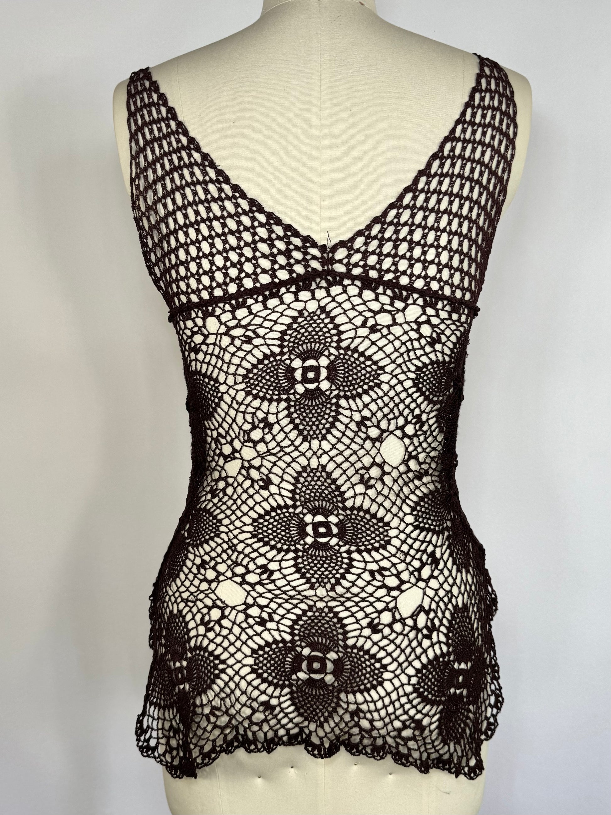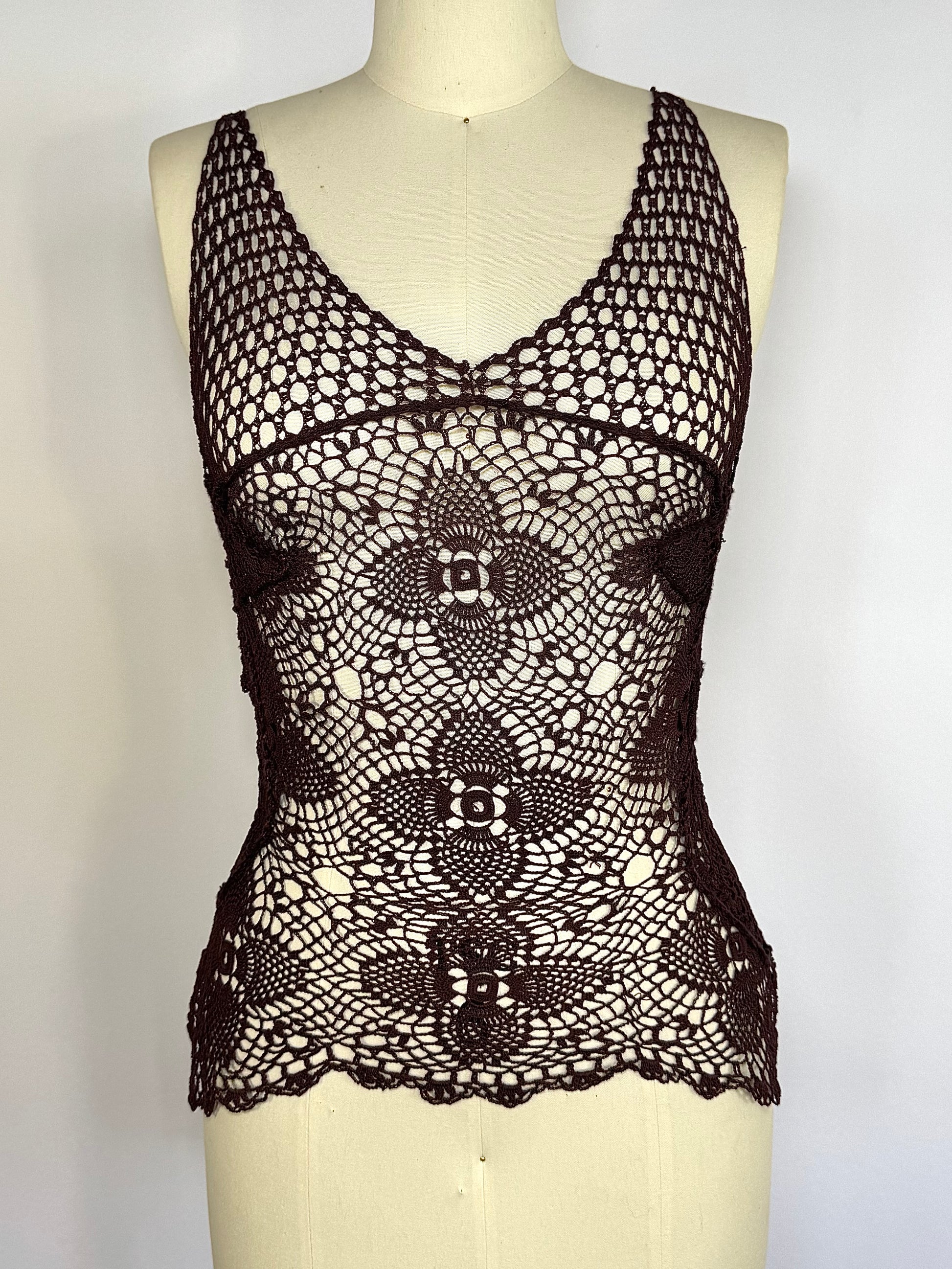 Rich in color and texture, the Tola Top features a chocolate brown palette and a striking combination of vintage crochet doilies and a crochet yoke. Designed as a relaxed tank silhouette, it fits sizes 2–4.